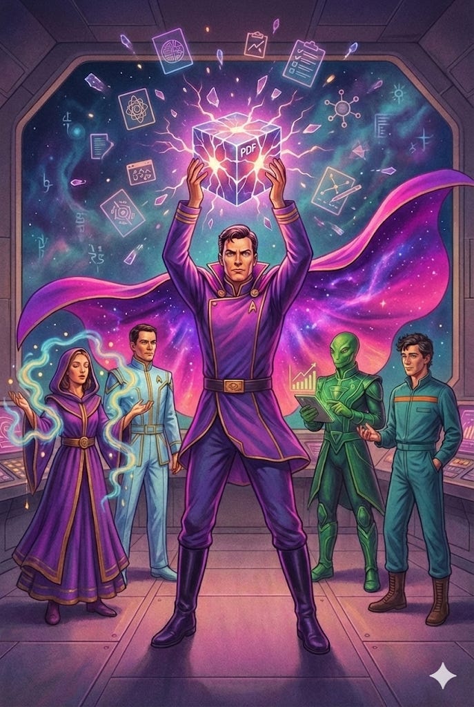 Captain Playbook materializes in a swirling cape gradient of fuchsia-to-neon hope, holding a glowing PDF cube as though it were a sacred relic.